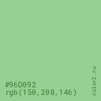 Цвет #96D092 в цветовой модели RGB обозначается тремя октетами (150, 208, 146) в десятичном формате и #96D092 в шестнадцатиричном (hex) формате, которые являются интенсивностью красного 150 (hex 96), интенсивность зелёного 208 (hex D0) и интенсивность синего 146 (hex 92).