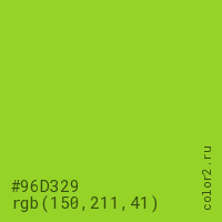 Цвет #96D329 в цветовой модели RGB обозначается тремя октетами (150, 211, 41) в десятичном формате и #96D329 в шестнадцатиричном (hex) формате, которые являются интенсивностью красного 150 (hex 96), интенсивность зелёного 211 (hex D3) и интенсивность синего 41 (hex 29).
