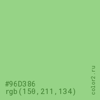 Цвет #96D386 в цветовой модели RGB обозначается тремя октетами (150, 211, 134) в десятичном формате и #96D386 в шестнадцатиричном (hex) формате, которые являются интенсивностью красного 150 (hex 96), интенсивность зелёного 211 (hex D3) и интенсивность синего 134 (hex 86).