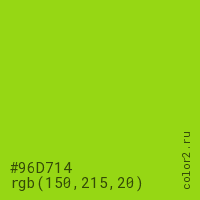 Цвет #96D714 в цветовой модели RGB обозначается тремя октетами (150, 215, 20) в десятичном формате и #96D714 в шестнадцатиричном (hex) формате, которые являются интенсивностью красного 150 (hex 96), интенсивность зелёного 215 (hex D7) и интенсивность синего 20 (hex 14).