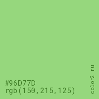 Цвет #96D77D в цветовой модели RGB обозначается тремя октетами (150, 215, 125) в десятичном формате и #96D77D в шестнадцатиричном (hex) формате, которые являются интенсивностью красного 150 (hex 96), интенсивность зелёного 215 (hex D7) и интенсивность синего 125 (hex 7D).