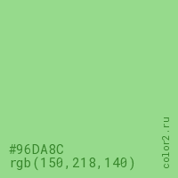 Цвет #96DA8C в цветовой модели RGB обозначается тремя октетами (150, 218, 140) в десятичном формате и #96DA8C в шестнадцатиричном (hex) формате, которые являются интенсивностью красного 150 (hex 96), интенсивность зелёного 218 (hex DA) и интенсивность синего 140 (hex 8C).