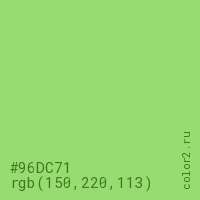 Цвет #96DC71 в цветовой модели RGB обозначается тремя октетами (150, 220, 113) в десятичном формате и #96DC71 в шестнадцатиричном (hex) формате, которые являются интенсивностью красного 150 (hex 96), интенсивность зелёного 220 (hex DC) и интенсивность синего 113 (hex 71).