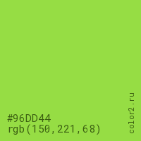 Цвет #96DD44 в цветовой модели RGB обозначается тремя октетами (150, 221, 68) в десятичном формате и #96DD44 в шестнадцатиричном (hex) формате, которые являются интенсивностью красного 150 (hex 96), интенсивность зелёного 221 (hex DD) и интенсивность синего 68 (hex 44).