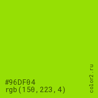 Цвет #96DF04 в цветовой модели RGB обозначается тремя октетами (150, 223, 4) в десятичном формате и #96DF04 в шестнадцатиричном (hex) формате, которые являются интенсивностью красного 150 (hex 96), интенсивность зелёного 223 (hex DF) и интенсивность синего 4 (hex 04).