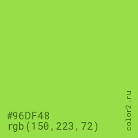 Цвет #96DF48 в цветовой модели RGB обозначается тремя октетами (150, 223, 72) в десятичном формате и #96DF48 в шестнадцатиричном (hex) формате, которые являются интенсивностью красного 150 (hex 96), интенсивность зелёного 223 (hex DF) и интенсивность синего 72 (hex 48).