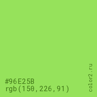 Цвет #96E25B в цветовой модели RGB обозначается тремя октетами (150, 226, 91) в десятичном формате и #96E25B в шестнадцатиричном (hex) формате, которые являются интенсивностью красного 150 (hex 96), интенсивность зелёного 226 (hex E2) и интенсивность синего 91 (hex 5B).