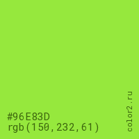 Цвет #96E83D в цветовой модели RGB обозначается тремя октетами (150, 232, 61) в десятичном формате и #96E83D в шестнадцатиричном (hex) формате, которые являются интенсивностью красного 150 (hex 96), интенсивность зелёного 232 (hex E8) и интенсивность синего 61 (hex 3D).