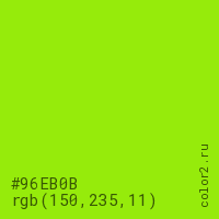 Цвет #96EB0B в цветовой модели RGB обозначается тремя октетами (150, 235, 11) в десятичном формате и #96EB0B в шестнадцатиричном (hex) формате, которые являются интенсивностью красного 150 (hex 96), интенсивность зелёного 235 (hex EB) и интенсивность синего 11 (hex 0B).