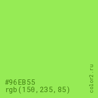 Цвет #96EB55 в цветовой модели RGB обозначается тремя октетами (150, 235, 85) в десятичном формате и #96EB55 в шестнадцатиричном (hex) формате, которые являются интенсивностью красного 150 (hex 96), интенсивность зелёного 235 (hex EB) и интенсивность синего 85 (hex 55).