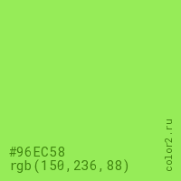 Цвет #96EC58 в цветовой модели RGB обозначается тремя октетами (150, 236, 88) в десятичном формате и #96EC58 в шестнадцатиричном (hex) формате, которые являются интенсивностью красного 150 (hex 96), интенсивность зелёного 236 (hex EC) и интенсивность синего 88 (hex 58).