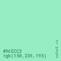 Цвет #96ECC3 в цветовой модели RGB обозначается тремя октетами (150, 236, 195) в десятичном формате и #96ECC3 в шестнадцатиричном (hex) формате, которые являются интенсивностью красного 150 (hex 96), интенсивность зелёного 236 (hex EC) и интенсивность синего 195 (hex C3).