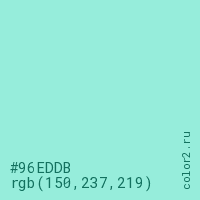 Цвет #96EDDB в цветовой модели RGB обозначается тремя октетами (150, 237, 219) в десятичном формате и #96EDDB в шестнадцатиричном (hex) формате, которые являются интенсивностью красного 150 (hex 96), интенсивность зелёного 237 (hex ED) и интенсивность синего 219 (hex DB).