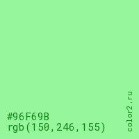 Цвет #96F69B в цветовой модели RGB обозначается тремя октетами (150, 246, 155) в десятичном формате и #96F69B в шестнадцатиричном (hex) формате, которые являются интенсивностью красного 150 (hex 96), интенсивность зелёного 246 (hex F6) и интенсивность синего 155 (hex 9B).