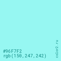 Цвет #96F7F2 в цветовой модели RGB обозначается тремя октетами (150, 247, 242) в десятичном формате и #96F7F2 в шестнадцатиричном (hex) формате, которые являются интенсивностью красного 150 (hex 96), интенсивность зелёного 247 (hex F7) и интенсивность синего 242 (hex F2).