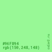 Цвет #96F894 в цветовой модели RGB обозначается тремя октетами (150, 248, 148) в десятичном формате и #96F894 в шестнадцатиричном (hex) формате, которые являются интенсивностью красного 150 (hex 96), интенсивность зелёного 248 (hex F8) и интенсивность синего 148 (hex 94).