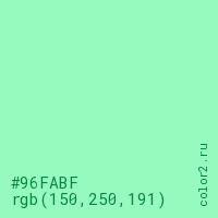 Цвет #96FABF в цветовой модели RGB обозначается тремя октетами (150, 250, 191) в десятичном формате и #96FABF в шестнадцатиричном (hex) формате, которые являются интенсивностью красного 150 (hex 96), интенсивность зелёного 250 (hex FA) и интенсивность синего 191 (hex BF).