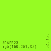 Цвет #96FB23 в цветовой модели RGB обозначается тремя октетами (150, 251, 35) в десятичном формате и #96FB23 в шестнадцатиричном (hex) формате, которые являются интенсивностью красного 150 (hex 96), интенсивность зелёного 251 (hex FB) и интенсивность синего 35 (hex 23).