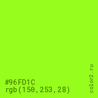 Цвет #96FD1C в цветовой модели RGB обозначается тремя октетами (150, 253, 28) в десятичном формате и #96FD1C в шестнадцатиричном (hex) формате, которые являются интенсивностью красного 150 (hex 96), интенсивность зелёного 253 (hex FD) и интенсивность синего 28 (hex 1C).