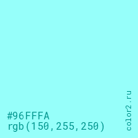 Цвет #96FFFA в цветовой модели RGB обозначается тремя октетами (150, 255, 250) в десятичном формате и #96FFFA в шестнадцатиричном (hex) формате, которые являются интенсивностью красного 150 (hex 96), интенсивность зелёного 255 (hex FF) и интенсивность синего 250 (hex FA).