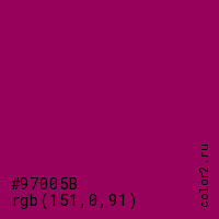 Цвет #97005B в цветовой модели RGB обозначается тремя октетами (151, 0, 91) в десятичном формате и #97005B в шестнадцатиричном (hex) формате, которые являются интенсивностью красного 151 (hex 97), интенсивность зелёного 0 (hex 00) и интенсивность синего 91 (hex 5B).