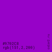 Цвет #9702C8 в цветовой модели RGB обозначается тремя октетами (151, 2, 200) в десятичном формате и #9702C8 в шестнадцатиричном (hex) формате, которые являются интенсивностью красного 151 (hex 97), интенсивность зелёного 2 (hex 02) и интенсивность синего 200 (hex C8).