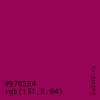 Цвет #970354 в цветовой модели RGB обозначается тремя октетами (151, 3, 84) в десятичном формате и #970354 в шестнадцатиричном (hex) формате, которые являются интенсивностью красного 151 (hex 97), интенсивность зелёного 3 (hex 03) и интенсивность синего 84 (hex 54).
