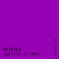 Цвет #9703B4 в цветовой модели RGB обозначается тремя октетами (151, 3, 180) в десятичном формате и #9703B4 в шестнадцатиричном (hex) формате, которые являются интенсивностью красного 151 (hex 97), интенсивность зелёного 3 (hex 03) и интенсивность синего 180 (hex B4).