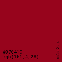 Цвет #97041C в цветовой модели RGB обозначается тремя октетами (151, 4, 28) в десятичном формате и #97041C в шестнадцатиричном (hex) формате, которые являются интенсивностью красного 151 (hex 97), интенсивность зелёного 4 (hex 04) и интенсивность синего 28 (hex 1C).