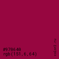 Цвет #970640 в цветовой модели RGB обозначается тремя октетами (151, 6, 64) в десятичном формате и #970640 в шестнадцатиричном (hex) формате, которые являются интенсивностью красного 151 (hex 97), интенсивность зелёного 6 (hex 06) и интенсивность синего 64 (hex 40).