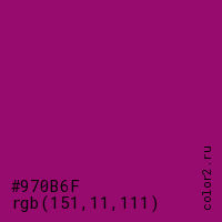Цвет #970B6F в цветовой модели RGB обозначается тремя октетами (151, 11, 111) в десятичном формате и #970B6F в шестнадцатиричном (hex) формате, которые являются интенсивностью красного 151 (hex 97), интенсивность зелёного 11 (hex 0B) и интенсивность синего 111 (hex 6F).