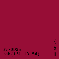 Цвет #970D36 в цветовой модели RGB обозначается тремя октетами (151, 13, 54) в десятичном формате и #970D36 в шестнадцатиричном (hex) формате, которые являются интенсивностью красного 151 (hex 97), интенсивность зелёного 13 (hex 0D) и интенсивность синего 54 (hex 36).