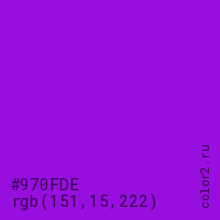 Цвет #970FDE в цветовой модели RGB обозначается тремя октетами (151, 15, 222) в десятичном формате и #970FDE в шестнадцатиричном (hex) формате, которые являются интенсивностью красного 151 (hex 97), интенсивность зелёного 15 (hex 0F) и интенсивность синего 222 (hex DE).