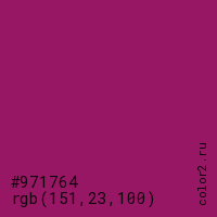 Цвет #971764 в цветовой модели RGB обозначается тремя октетами (151, 23, 100) в десятичном формате и #971764 в шестнадцатиричном (hex) формате, которые являются интенсивностью красного 151 (hex 97), интенсивность зелёного 23 (hex 17) и интенсивность синего 100 (hex 64).
