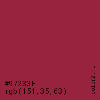 Цвет #97233F в цветовой модели RGB обозначается тремя октетами (151, 35, 63) в десятичном формате и #97233F в шестнадцатиричном (hex) формате, которые являются интенсивностью красного 151 (hex 97), интенсивность зелёного 35 (hex 23) и интенсивность синего 63 (hex 3F).