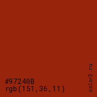 Цвет #97240B в цветовой модели RGB обозначается тремя октетами (151, 36, 11) в десятичном формате и #97240B в шестнадцатиричном (hex) формате, которые являются интенсивностью красного 151 (hex 97), интенсивность зелёного 36 (hex 24) и интенсивность синего 11 (hex 0B).