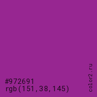 Цвет #972691 в цветовой модели RGB обозначается тремя октетами (151, 38, 145) в десятичном формате и #972691 в шестнадцатиричном (hex) формате, которые являются интенсивностью красного 151 (hex 97), интенсивность зелёного 38 (hex 26) и интенсивность синего 145 (hex 91).