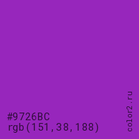 Цвет #9726BC в цветовой модели RGB обозначается тремя октетами (151, 38, 188) в десятичном формате и #9726BC в шестнадцатиричном (hex) формате, которые являются интенсивностью красного 151 (hex 97), интенсивность зелёного 38 (hex 26) и интенсивность синего 188 (hex BC).