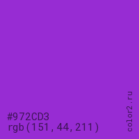 Цвет #972CD3 в цветовой модели RGB обозначается тремя октетами (151, 44, 211) в десятичном формате и #972CD3 в шестнадцатиричном (hex) формате, которые являются интенсивностью красного 151 (hex 97), интенсивность зелёного 44 (hex 2C) и интенсивность синего 211 (hex D3).