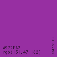 Цвет #972FA2 в цветовой модели RGB обозначается тремя октетами (151, 47, 162) в десятичном формате и #972FA2 в шестнадцатиричном (hex) формате, которые являются интенсивностью красного 151 (hex 97), интенсивность зелёного 47 (hex 2F) и интенсивность синего 162 (hex A2).
