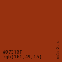 Цвет #97310F в цветовой модели RGB обозначается тремя октетами (151, 49, 15) в десятичном формате и #97310F в шестнадцатиричном (hex) формате, которые являются интенсивностью красного 151 (hex 97), интенсивность зелёного 49 (hex 31) и интенсивность синего 15 (hex 0F).