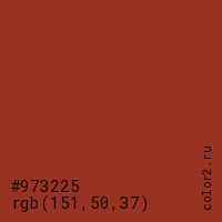 Цвет #973225 в цветовой модели RGB обозначается тремя октетами (151, 50, 37) в десятичном формате и #973225 в шестнадцатиричном (hex) формате, которые являются интенсивностью красного 151 (hex 97), интенсивность зелёного 50 (hex 32) и интенсивность синего 37 (hex 25).