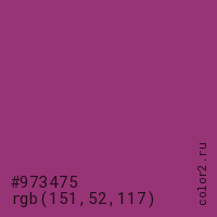 Цвет #973475 в цветовой модели RGB обозначается тремя октетами (151, 52, 117) в десятичном формате и #973475 в шестнадцатиричном (hex) формате, которые являются интенсивностью красного 151 (hex 97), интенсивность зелёного 52 (hex 34) и интенсивность синего 117 (hex 75).
