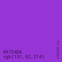 Цвет #9734D6 в цветовой модели RGB обозначается тремя октетами (151, 52, 214) в десятичном формате и #9734D6 в шестнадцатиричном (hex) формате, которые являются интенсивностью красного 151 (hex 97), интенсивность зелёного 52 (hex 34) и интенсивность синего 214 (hex D6).