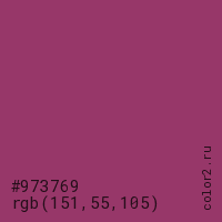 Цвет #973769 в цветовой модели RGB обозначается тремя октетами (151, 55, 105) в десятичном формате и #973769 в шестнадцатиричном (hex) формате, которые являются интенсивностью красного 151 (hex 97), интенсивность зелёного 55 (hex 37) и интенсивность синего 105 (hex 69).
