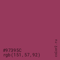 Цвет #97395C в цветовой модели RGB обозначается тремя октетами (151, 57, 92) в десятичном формате и #97395C в шестнадцатиричном (hex) формате, которые являются интенсивностью красного 151 (hex 97), интенсивность зелёного 57 (hex 39) и интенсивность синего 92 (hex 5C).