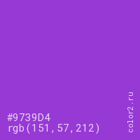 Цвет #9739D4 в цветовой модели RGB обозначается тремя октетами (151, 57, 212) в десятичном формате и #9739D4 в шестнадцатиричном (hex) формате, которые являются интенсивностью красного 151 (hex 97), интенсивность зелёного 57 (hex 39) и интенсивность синего 212 (hex D4).