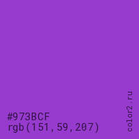 Цвет #973BCF в цветовой модели RGB обозначается тремя октетами (151, 59, 207) в десятичном формате и #973BCF в шестнадцатиричном (hex) формате, которые являются интенсивностью красного 151 (hex 97), интенсивность зелёного 59 (hex 3B) и интенсивность синего 207 (hex CF).