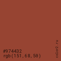 Цвет #974432 в цветовой модели RGB обозначается тремя октетами (151, 68, 50) в десятичном формате и #974432 в шестнадцатиричном (hex) формате, которые являются интенсивностью красного 151 (hex 97), интенсивность зелёного 68 (hex 44) и интенсивность синего 50 (hex 32).