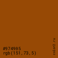 Цвет #974905 в цветовой модели RGB обозначается тремя октетами (151, 73, 5) в десятичном формате и #974905 в шестнадцатиричном (hex) формате, которые являются интенсивностью красного 151 (hex 97), интенсивность зелёного 73 (hex 49) и интенсивность синего 5 (hex 05).